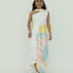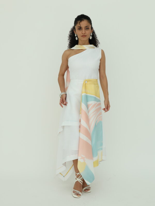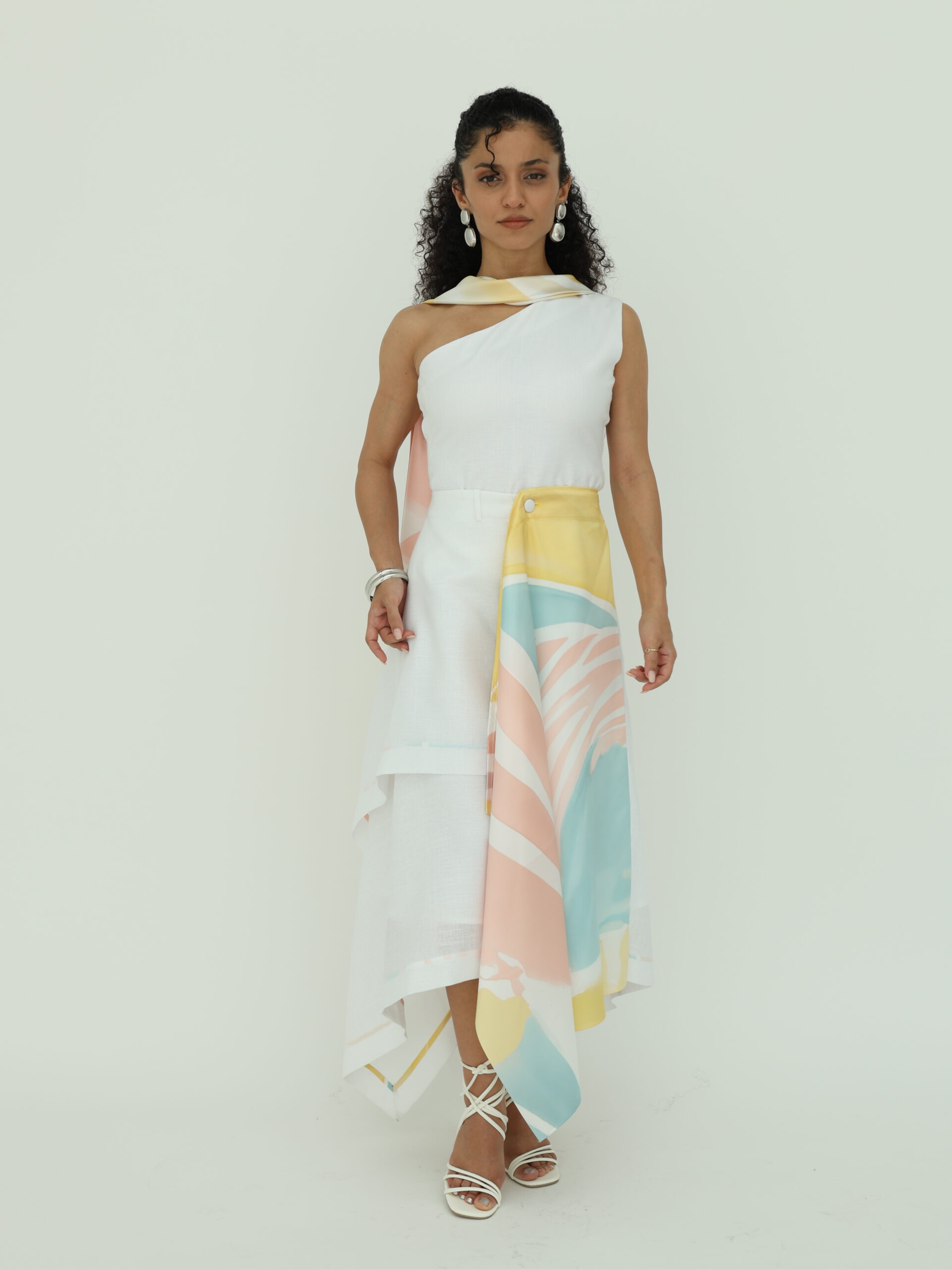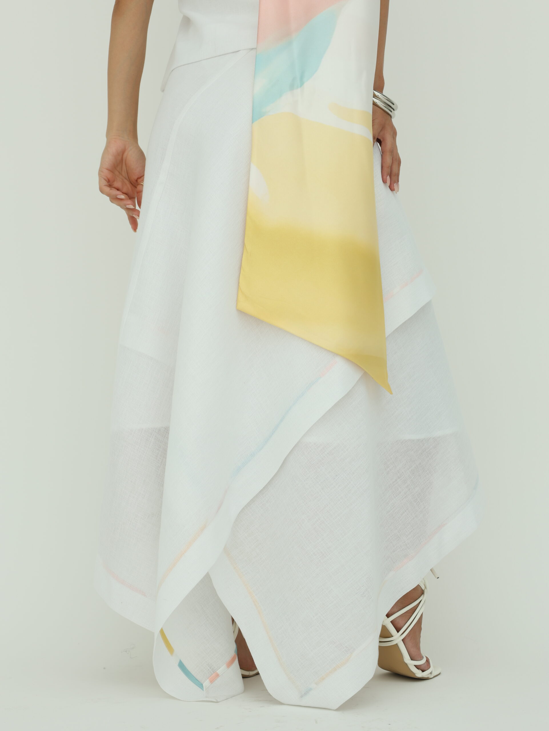 تفاصيل التصميم: تنورة متوسطة الطول بقصّة غير متماثلة وطبقات متدرجة، تمنح إطلالة انسيابية تتحرك بسلاسة مع كل خطوة