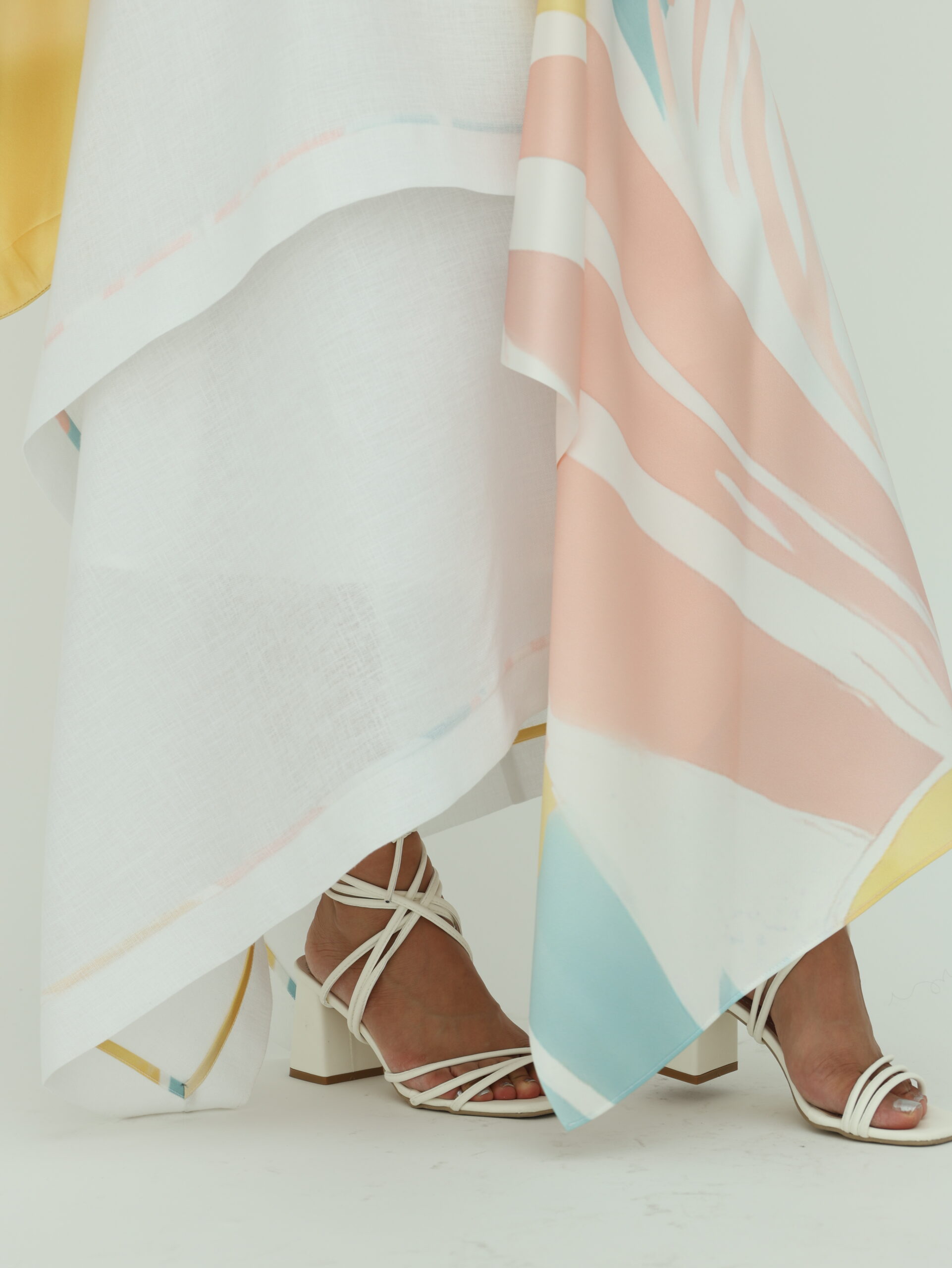 الخامة: لنن فاخر عالي الجودة (80% لنن، 20% قطن)، وشاح مطبوع من حرير كريب ياباني (70% حرير كريب، 30% بوليستر)، مع بطانة من الكريب (100% بوليستر).