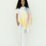 في التصاميم التي تتزيّن بطبعات فنية، قد يختلف تموضع العمل الفني من قطعة لأخرى نتيجة عملية قص القماش، مما يمنح كل تصميم طابعًا خاصًا ويجعل كل قطعة بمثابة عمل فني متفرّد يمكن ارتداؤه.
