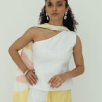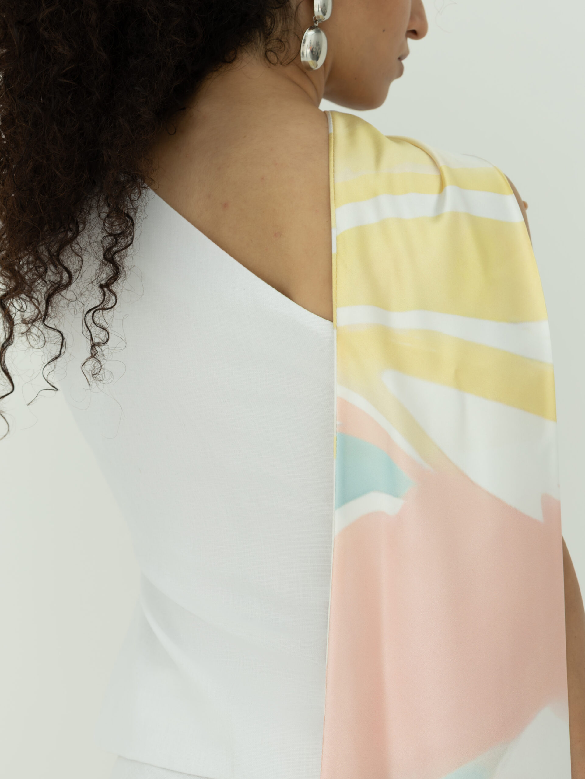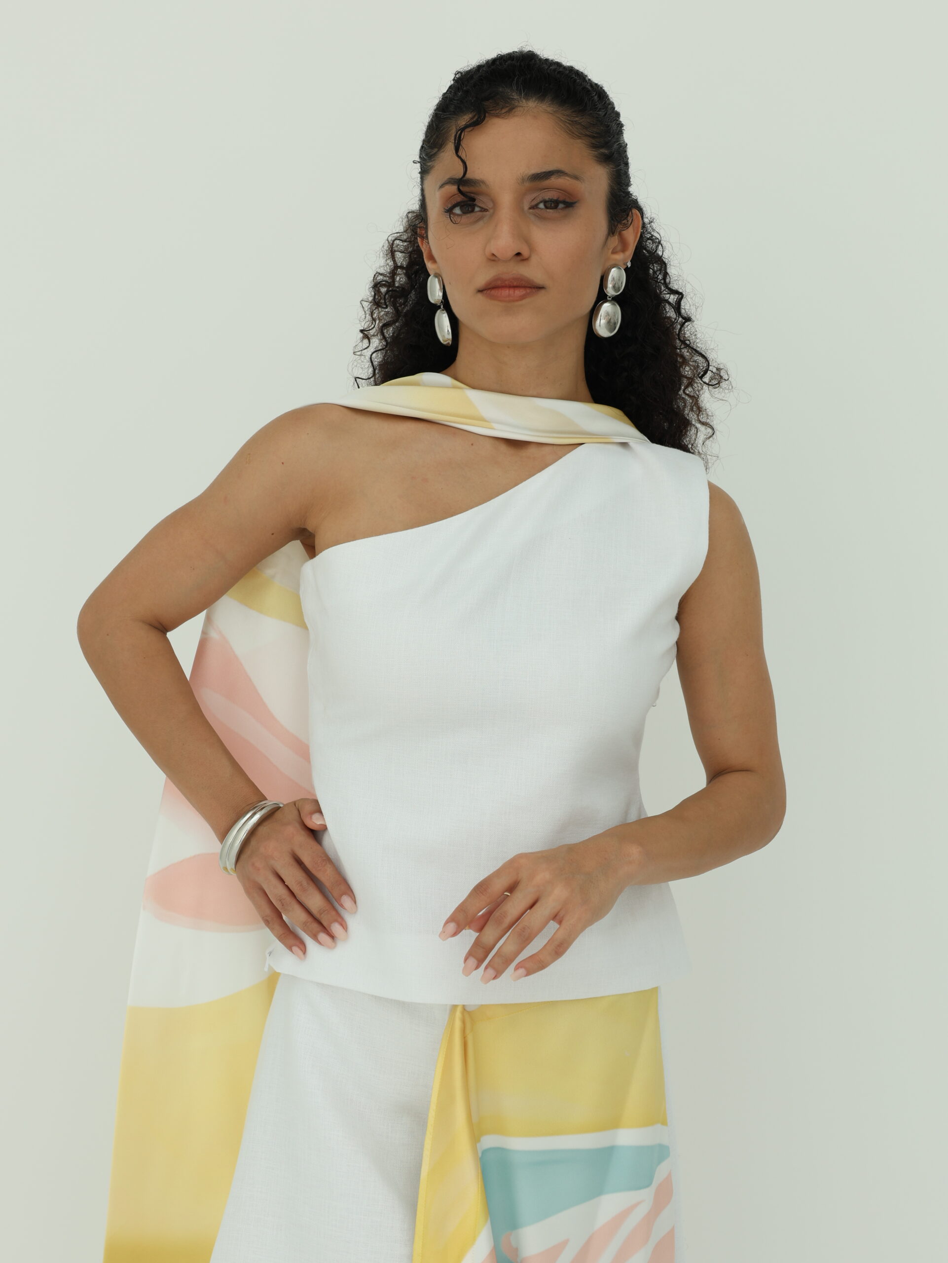 فاصيل التصميم: بلوزة بلا أكمام بكتف واحد، مزينة بوشاح مطبوع ينسدل بنعومة عند خط العنق، ليمنح لمسة نهائية أنيقة